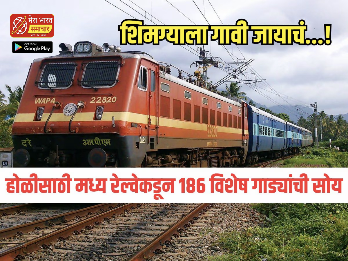 होळी आणि शिमग्याच्या पार्श्वभूमीवर प्रवाशांची वाढती गर्दी लक्षात घेता मध्य रेल्वेने 186 विशेष ट्रेन चालवण्याचा निर्णय घेतला आहे. यामध्ये 94 होळी विशेष ट्रेन आणि 92 नियमित विशेष ट्रेनचा समावेश आहे. विशेष ट्रेन मुंबई-नागपूर, सावंतवाडी रोड, बनारस, गोरखपूर, समस्तीपूर, दानापूर तसेच पुणे-नागपूर, हजरत निजामुद्दीन व दानापूर या मार्गावर धावणार आहेत.